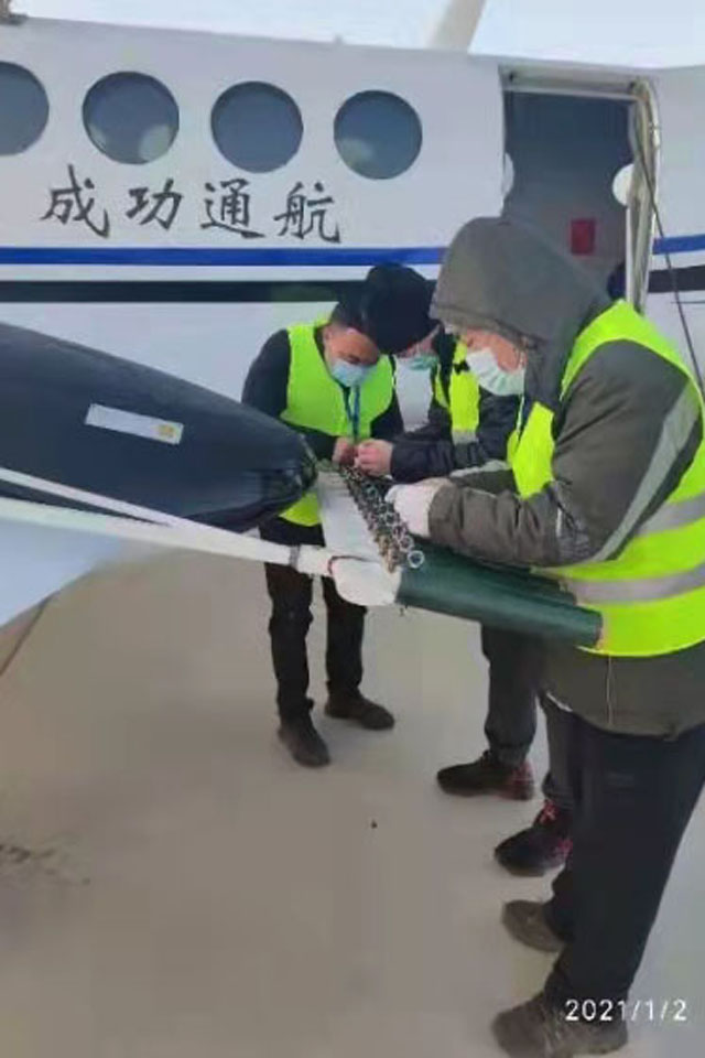 新年伊始,远在新疆若羌机场执勤的伟德国际1946通航B-10JQ机组成员却迎来了繁忙的一天。1月1日,天气预报显示,当地有大范围的降雪过程,机组成员冒着零下47度的严寒,准备飞机、调试设备,一切都在紧张有序、有条不紊地进行。1月2日,一架空中国王350高性能飞机便划破长空、凌空而起,穿行在茫茫云海,开始了2021年新疆人工增雪的首飞,当日就飞行4小时13分,新疆也迎来了新年的首场降雪。