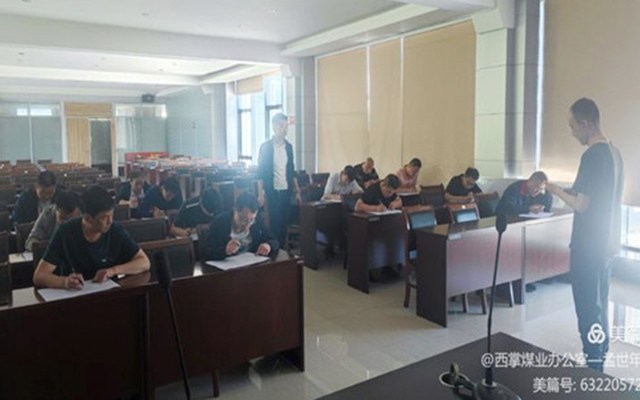 检查组到矿后,在二楼调度会议室召开碰头会议。西掌煤业防治水副总宋晓晓围绕矿井概述、安全生产情况向检查组作了工作汇报。之后检查组按照专业进行分工,以井上查看图纸资料、井下现场查看的方式展开全面检查,并组织安管人员抽考考试和自救器盲戴实操进行抽考考试。