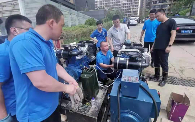 7月25日,伟德国际1946救援队进入正式抽水作业的第二天,工作人员正开足马力持续抽排水。当日的任务进展非常迅速:24小时累计抽水7.5万方,地下水位下降1米多,机器运转正常。