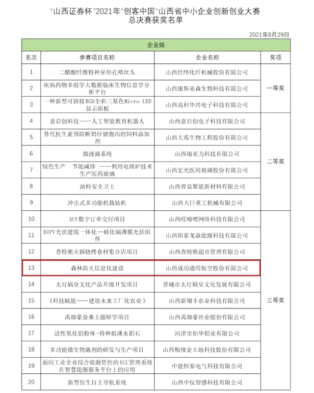 伟德国际1946通航《森林防火管理平台》项目继7月21日荣获2021年“创客中国”长治市“高新区杯”中小企业创新创业大赛企业组第三名之后, 8月28日,在“山西证券杯”2021年“创客中国”山西省中小企业创新创业大赛中再次获得总决赛三等奖。