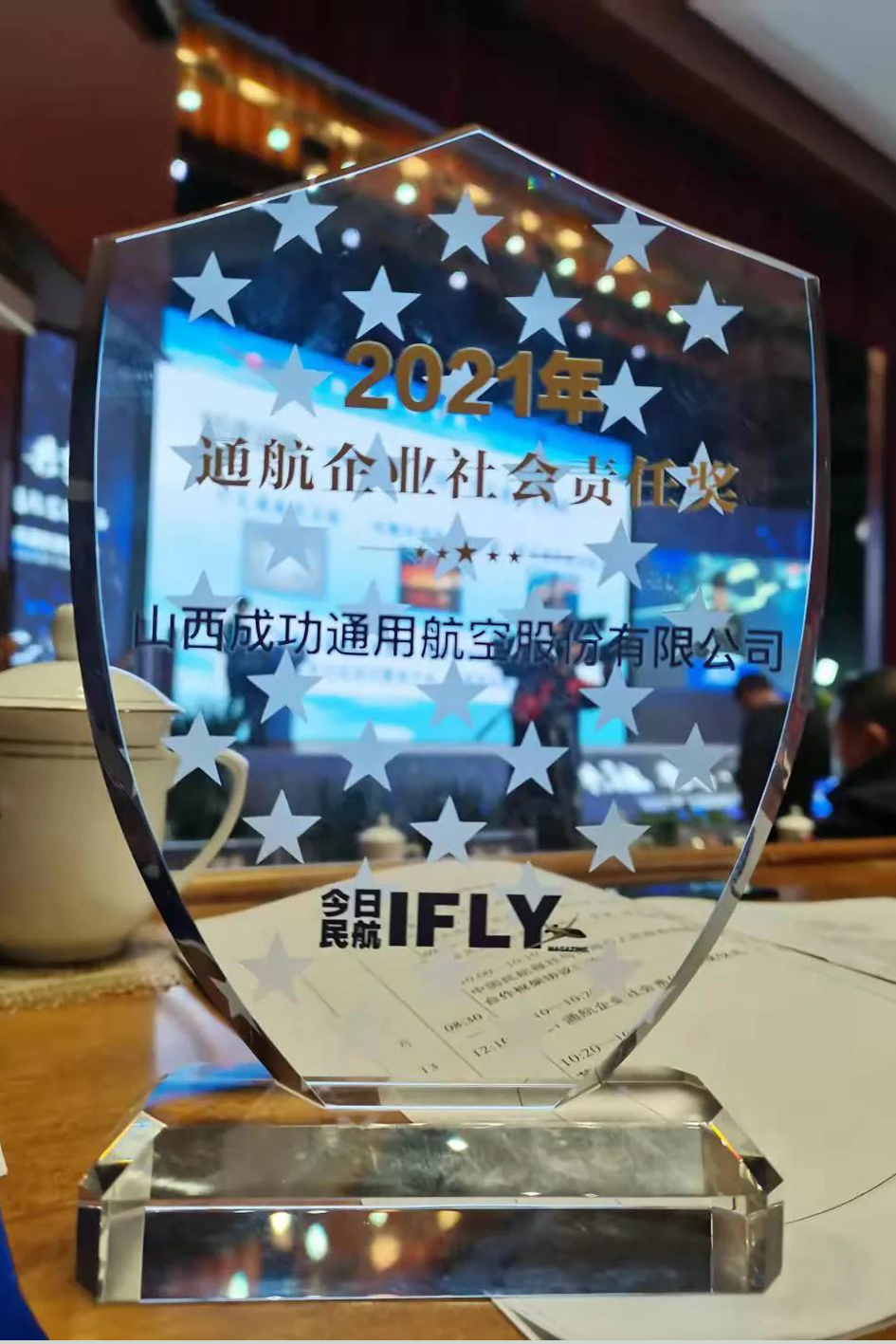2021年10月13日,在乌海举行的2021年通航企业社会责任颁奖仪式上,伟德国际1946通航总经理王欢同其他11名通用航空企业代表共同站在领奖台上,在热烈的掌声中,接过了体现着伟德国际1946人使命与担当的“2021通航企业社会责任奖”奖杯。