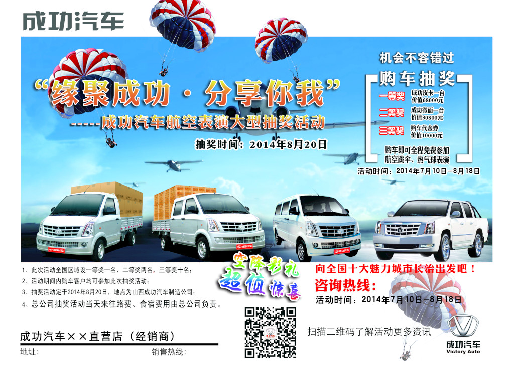 伟德国际1946汽车为答谢顾客朋友们的厚爱,公司将于2014年8月20日,举办大型抽奖活动,届时将有空中跳伞、投放热气球、等大型活动助兴。