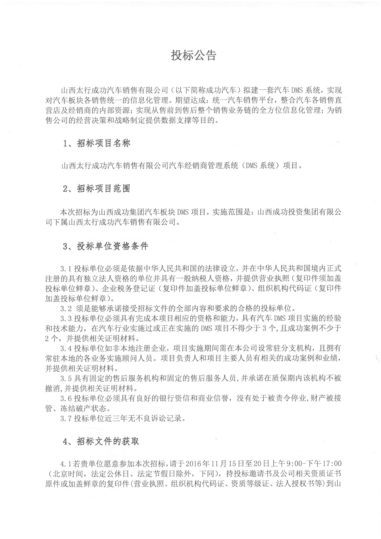 山西太行伟德国际1946汽车销售有限公司汽车经销商管理系统(DMS系统)项目招标公告