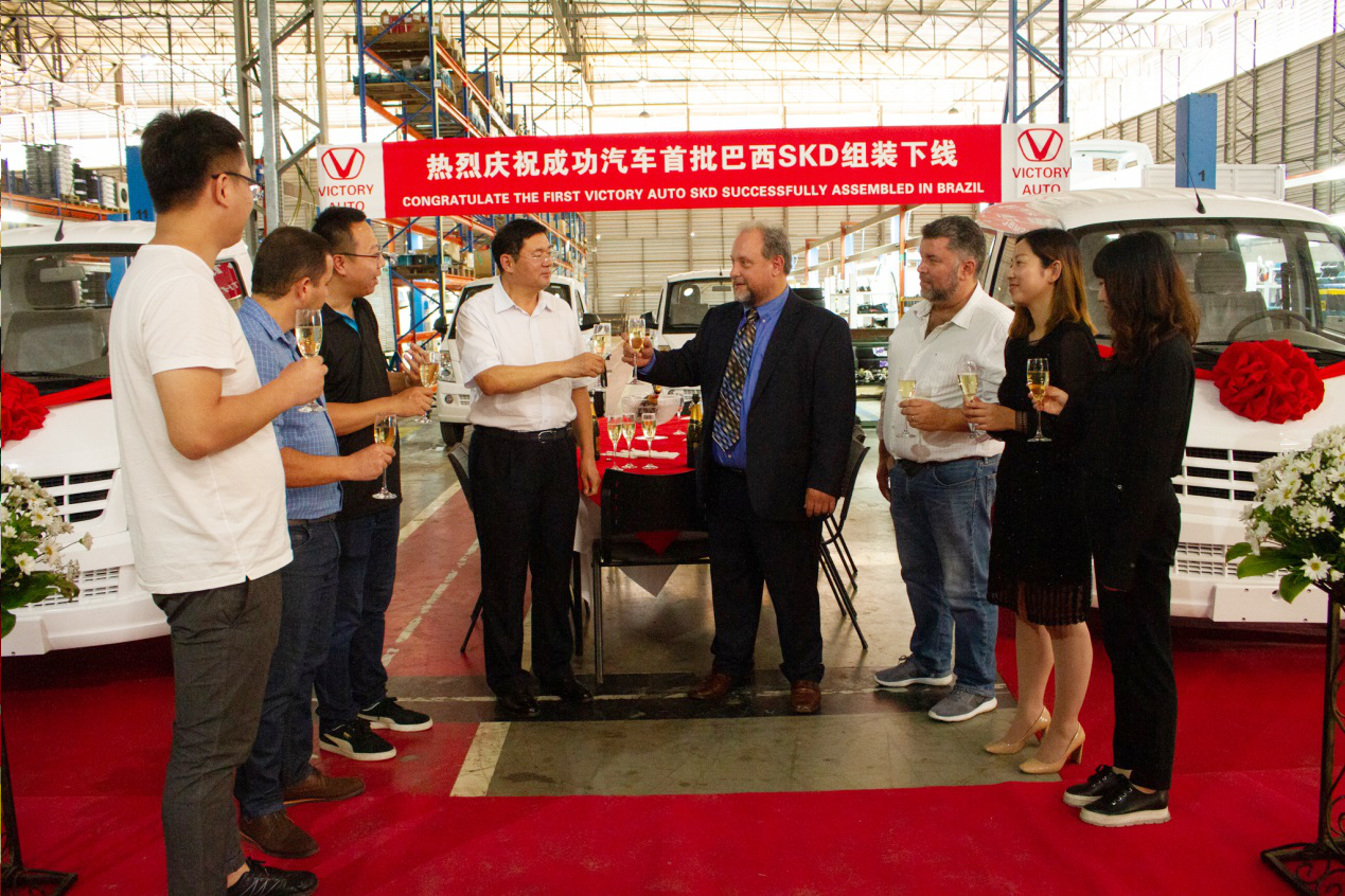 双方代表为伟德国际1946汽车巴西KD组装工厂首台下线共同举杯