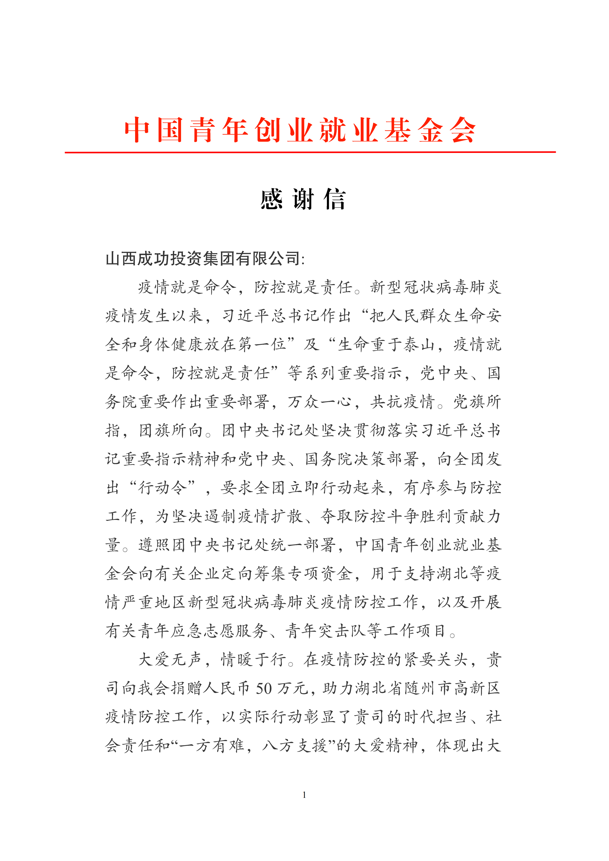 为贯彻习近平总书记“把人民群众生命安全和身体健康放在第一位”及“生命重于泰山,疫情就是命令,防控就是责任”等系列重要指示精神和党中央、国务院决策部署,集团于2月6日与中国青年创业基金会签订协议,向疫情最为严重的湖北省捐赠50万,以表示对疫区人民战胜疫情的定向支持,体现了对社会责任的担当和作为。近日,中国青年创业就业基金会特发来感谢信。